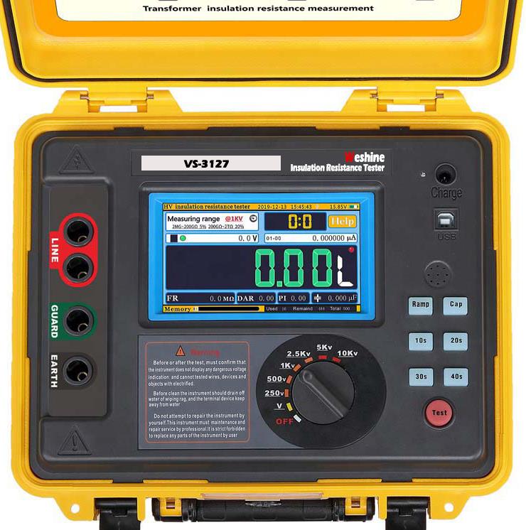 Weshine® VS-3127 ist batteriebetriebenIsolationstest des Transformatorsmit digitaler und analoger Lichtbogenanzeige, konzipiert für Hochspannungs-Isolationswiderstandsprüfungen bei der Wartung und Instandhaltung von Kabeln, rotierenden Maschinen, Transformatoren, Schaltanlagen und Industrieanwendungen.